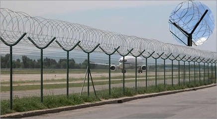 機場護欄網(wǎng)在行業中又稱作“Y型安(ān)全防禦護網”,其組成(chéng)是由V型支架立拄,加強型焊接片(piàn)網(wǎng),安全防盜連接件和熱(rè)鍍鋅刀片刺籠組成,是強度和安全防禦性級別很高的護欄網產品。
